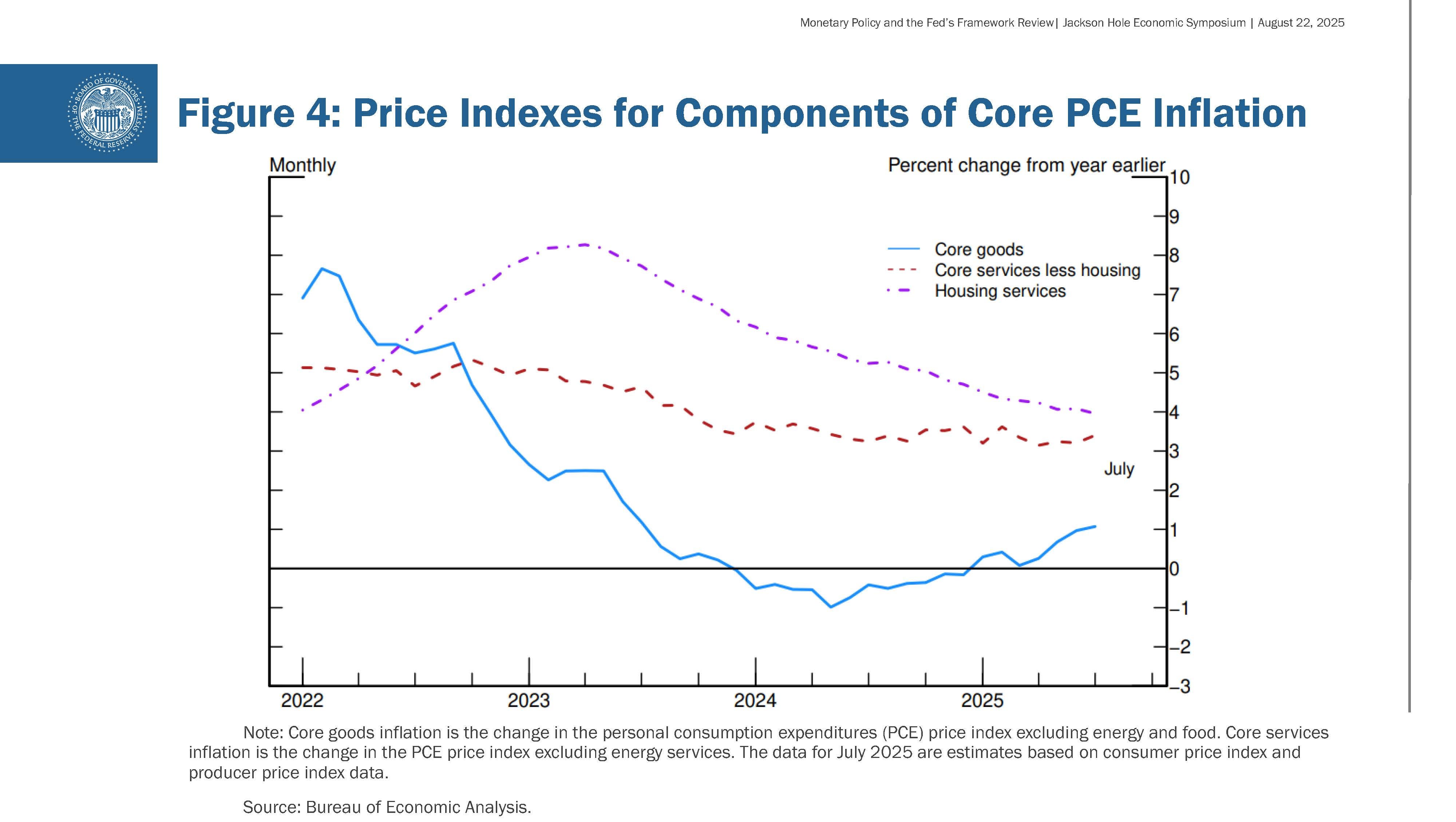 ⁴ 使用消費者物價指數和其他資訊,估計 7 月份住房服務對 12 個月核心 PCE 通膨的貢獻為 0.7 個百分點,而剔除住房的核心服務貢獻了 2.0 個百分點。這兩個類別的貢獻仍然略高於其在 2002-07 年期間的平均水平,當時核心 PCE 通膨平均約為 2%。相比之下,7 月份核心商品對 12 個月核心 PCE 通膨的貢獻約為 0.25 個百分點,而 2002-07 年的平均值為 -0.25 個百分點。