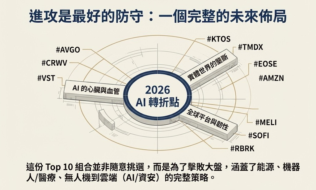 這個 Top 10 組合為了擊敗大盤,它涵蓋了能源、機器人/醫療、無人機到雲端(AI/資安)的完整佈局。我們看的是 2026 年AI物理世界與數位世界融合的必然趨勢。