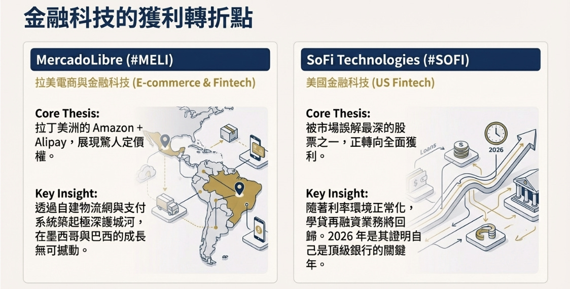 在通膨高漲的拉美,MELI 展現了驚人的定價權。透過自建物流網(類似 Amazon)與支付系統(類似 Alipay),它築起了極深的護城河。相比於單純的銀行,MELI 的生態系讓它在墨西哥與巴西的成長無可撼動。