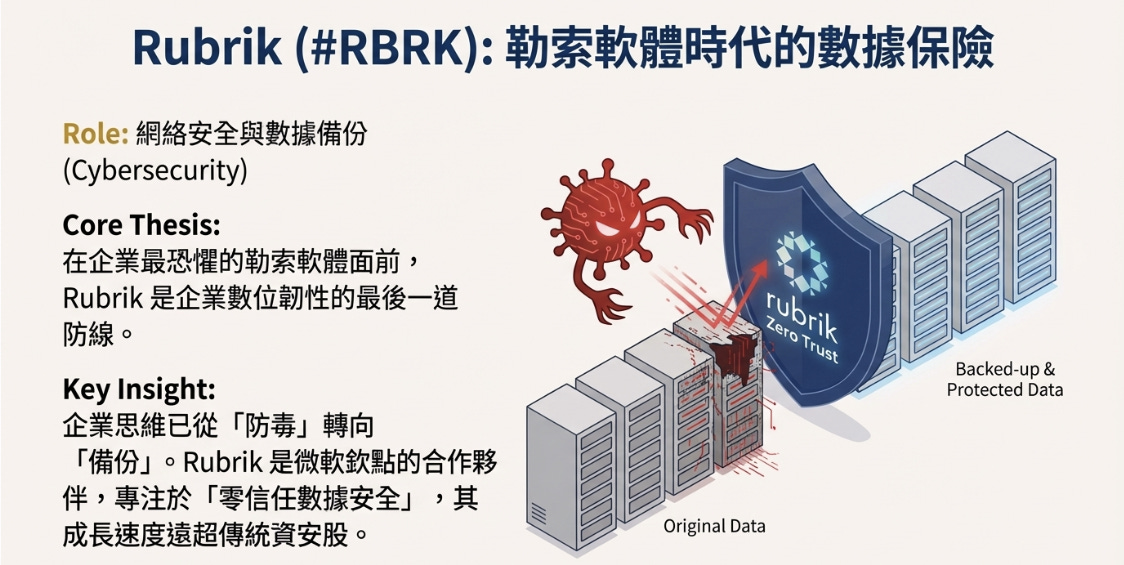 面對 AI 驅動的攻擊,企業思維已從「防毒」轉向「備份」。Rubrik 是微軟欽點的合作夥伴,專注於「零信任數據安全」。在企業最恐懼的勒索軟體面前,Rubrik 是最後一道防線,其成長速度遠超傳統資安股。
