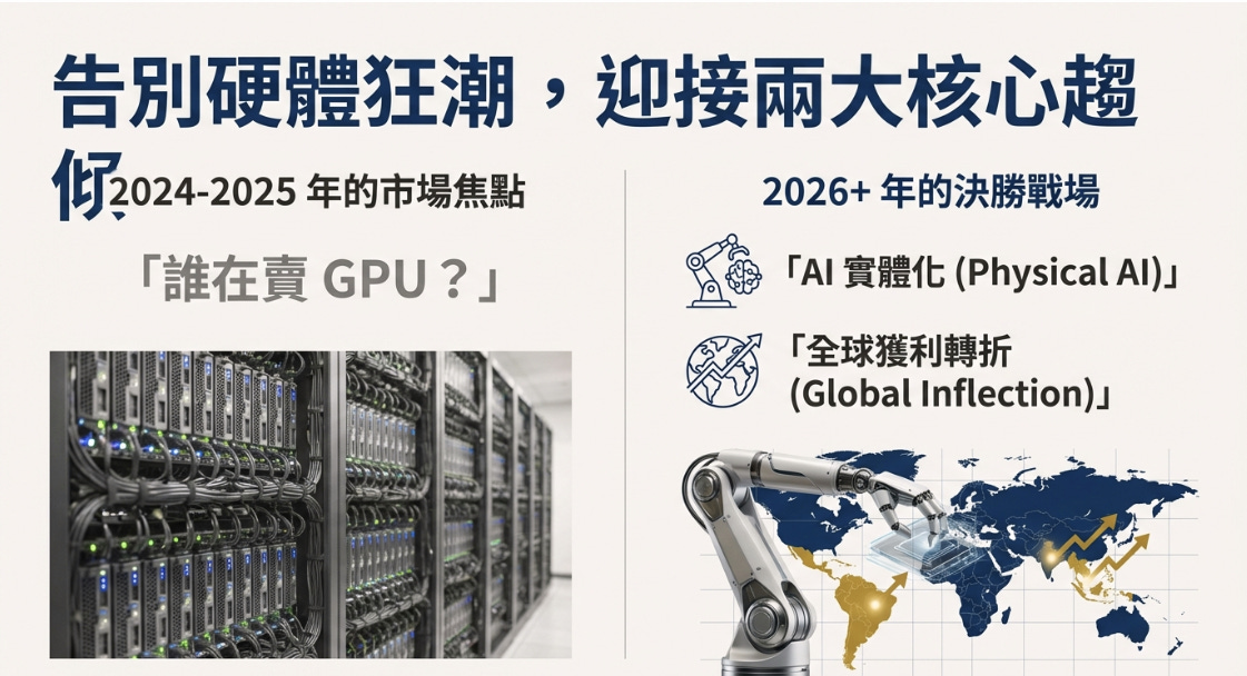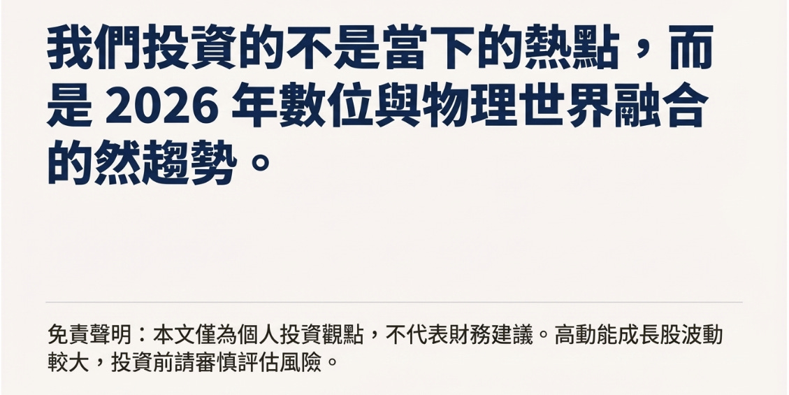 我的 2026 年投資組合不是追逐「誰在賣 GPU」,而是轉向「AI 實體化 (Physical AI)」與「全球獲利轉折 (Global Inflection)」。