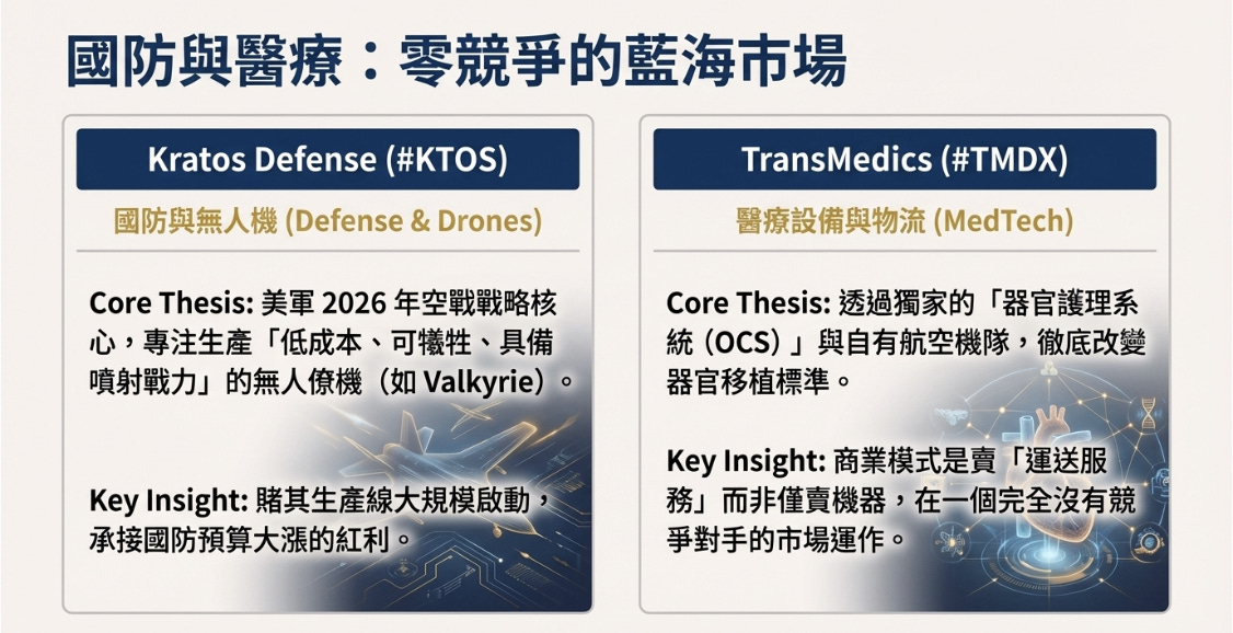 美軍 2026 年的空戰戰略核心是「無人僚機」。不同於昂貴的 F-35,KTOS 專注於生產「低成本、可犧牲、具備噴射戰力」的無人機(如 Valkyrie)。我是賭其生產線大規模啟動,承接國防預算大漲的紅利。