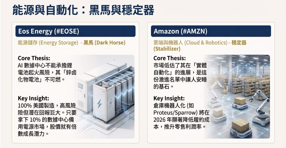 除了 AWS 的 AI 獲利外,市場低估了 Amazon 在「實體自動化」的進展。其倉庫機器人化(如 Proteus/Sparrow)將在 2026 年顯著降低履約成本,推升零售利潤率。它是這份激進名單中,讓我晚上睡得著覺的穩定器。