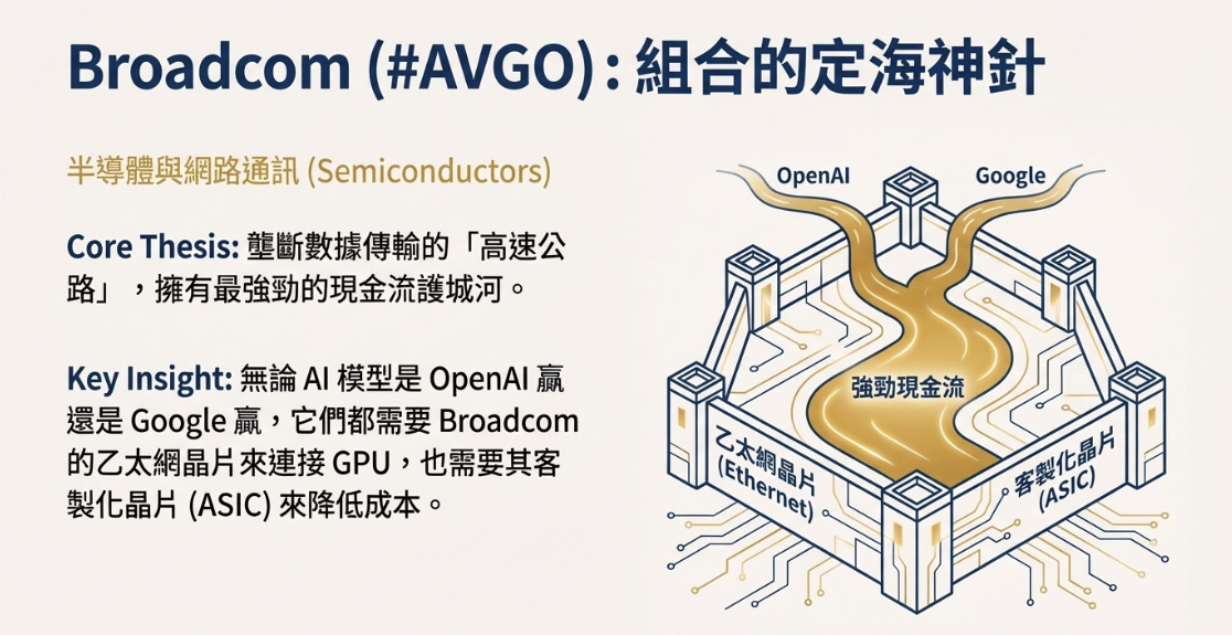 這是我組合中的定海神針。無論 AI 模型是 OpenAI 贏還是 Google 贏,它們都需要 Broadcom 的乙太網晶片來連接數萬顆 GPU,也需要其客製化晶片 (ASIC) 來降低成本。它壟斷了數據傳輸的「高速公路」,擁有最強勁的現金流護城河。
