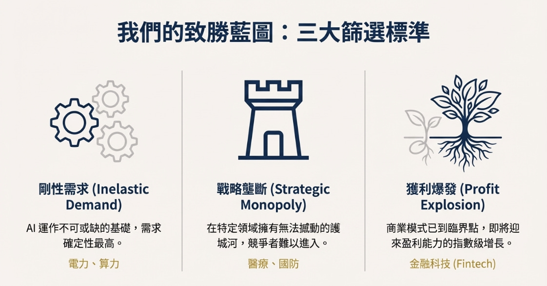 這份清單是基於以下篩選:剛性需求(電力/算力)、戰略壟斷(醫療/國防)、以及獲利爆發(Fintech)。