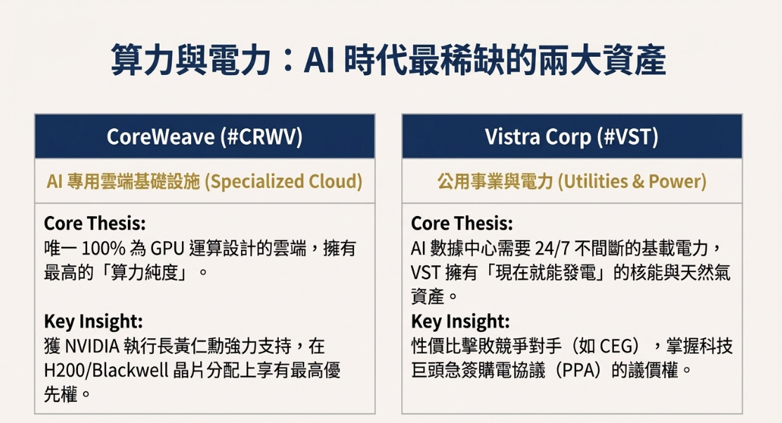 當 AWS 和 Google Cloud 還在兼顧傳統業務時,CoreWeave 是唯一 100% 為 GPU 運算設計的雲端。NVIDIA 執行長黃仁勳的強力支持,使其在 H200/Blackwell 晶片分配上享有最高優先權。在 2026 年企業爭相訓練私有模型的算力軍備競賽中,CoreWeave 的「算力純度」與「效能」將使其成為最大贏家。