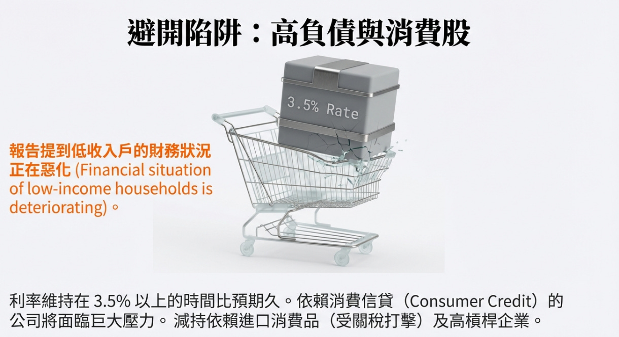 避開高負債消費股: 報告提到低收入戶的財務狀況正在惡化 ,加上利率維持在 3.5% 以上,依賴消費信貸的公司會很辛苦。