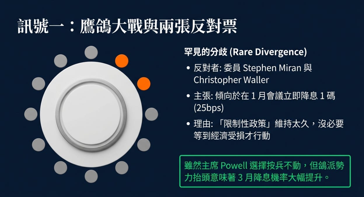 鷹鴿大戰:兩張反對票出現 這在過去幾年的會議中非常罕見。委員 Stephen Miran 和 Christopher Waller 投下了反對票,他們傾向於在這次會議就降息 1 碼 (25bps) 。聯準會內部認為「限制性政策」已經夠久了。雖然主席 Powell 選擇按兵不動,但內部的鴿派勢力正在抬頭,下一次會議(3月)降息的機率大幅提升。