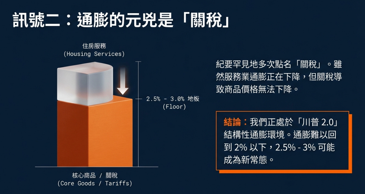通膨的元兇:關稅 (Tariffs) 紀要中罕見地多次提到「關稅」。官員們指出,核心商品 (Core Goods) 的通膨反彈,主要歸咎於關稅上漲 。住房服務通膨在下降 ,但關稅讓商品價格降不下來。這確認我們處於「川普 2.0」的結構性通膨環境中。
