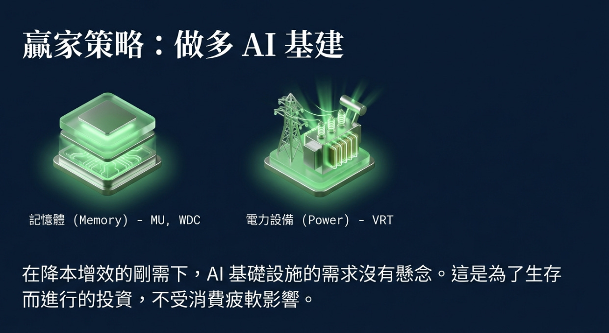 做多 AI 基建:Fed 既然承認 AI 投資強勁 ,那麼記憶體 MU 0.00%↑ , WDC 0.00%↑ 和 電力設備 VRT 0.00%↑ 的需求就沒有懸念。