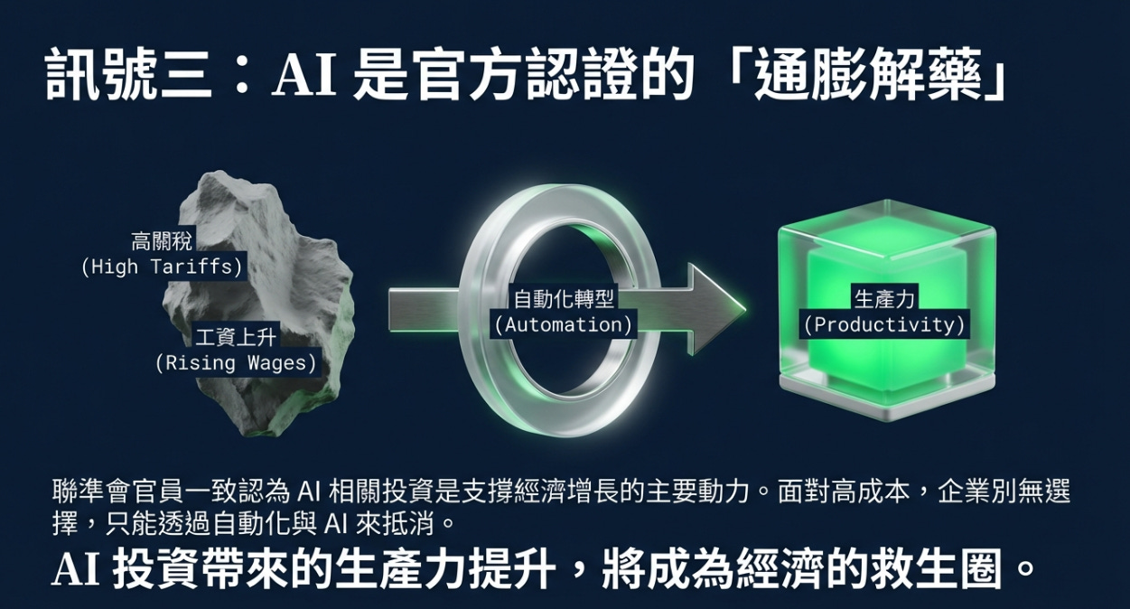 這份報告在於 Fed 官員討論了 AI 對抗通膨 的可能性。幾位參與者指出,企業正在透過自動化 (Automation) 和 AI 來抵消成本上升(例如關稅帶來的成本)。AI 投資帶來的生產力提升,將支持經濟增長 。因為在高關稅、高工資的環境下,企業不得不買 AI 來降本增效。
