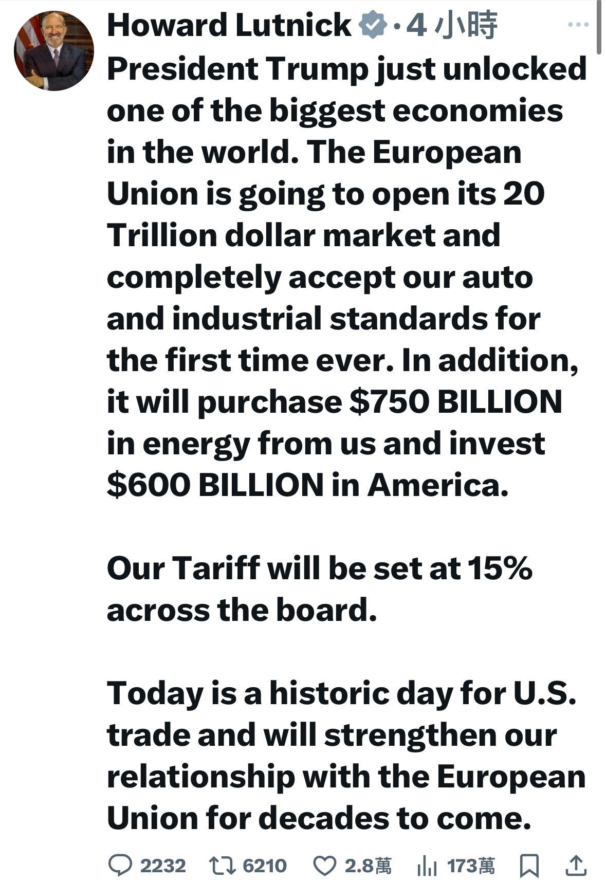 歐盟將開放其20兆美元的市場,並首次完全接受美國的汽車和工業標準。 此外將從美國購買7500億美元的能源,並在美國投資6000億美元。 我們的關稅將統一設定為15%。 今天是美國貿易的歷史性一天,將在未來幾十年加強我們與歐盟的關係。