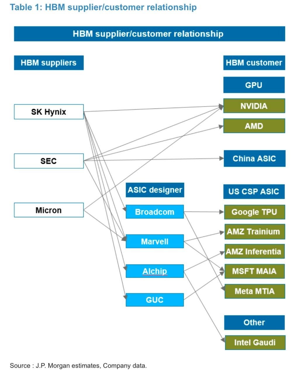 請看這張大叔幫大家整理的 HBM 供應商/客戶關係圖 (Table 1)。這張圖揭露了 AI 產業最殘酷的真相: