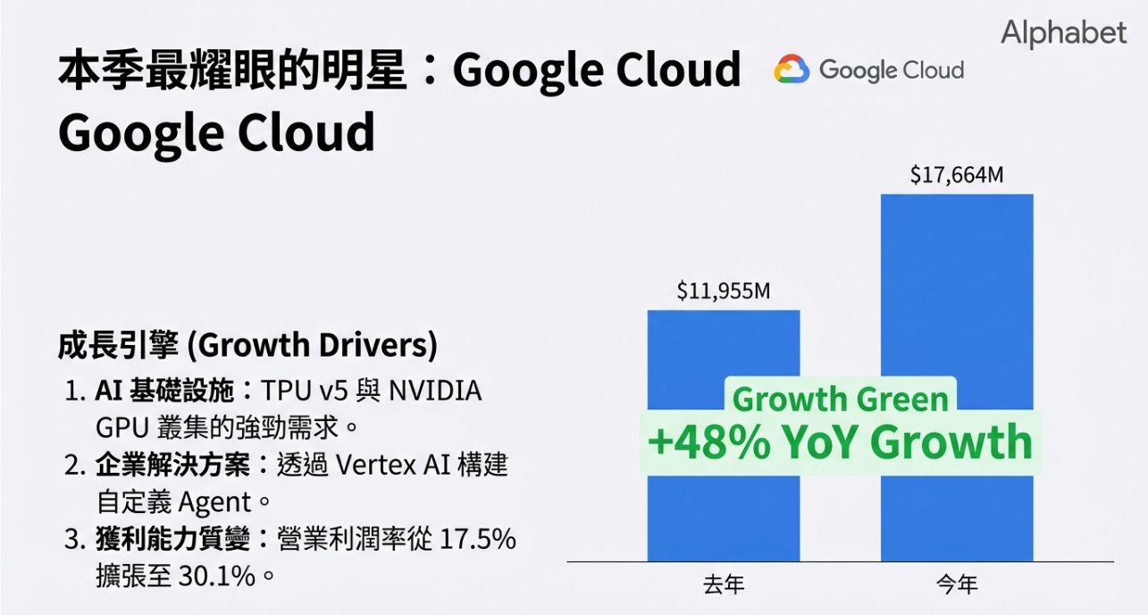 在雲端運算的三國殺(AWS、Azure、GCP)中,Google Cloud 長期位居第三。然而在 AI 時代,GCP 似乎找到了超車的彎道。48% 高於市場預期。