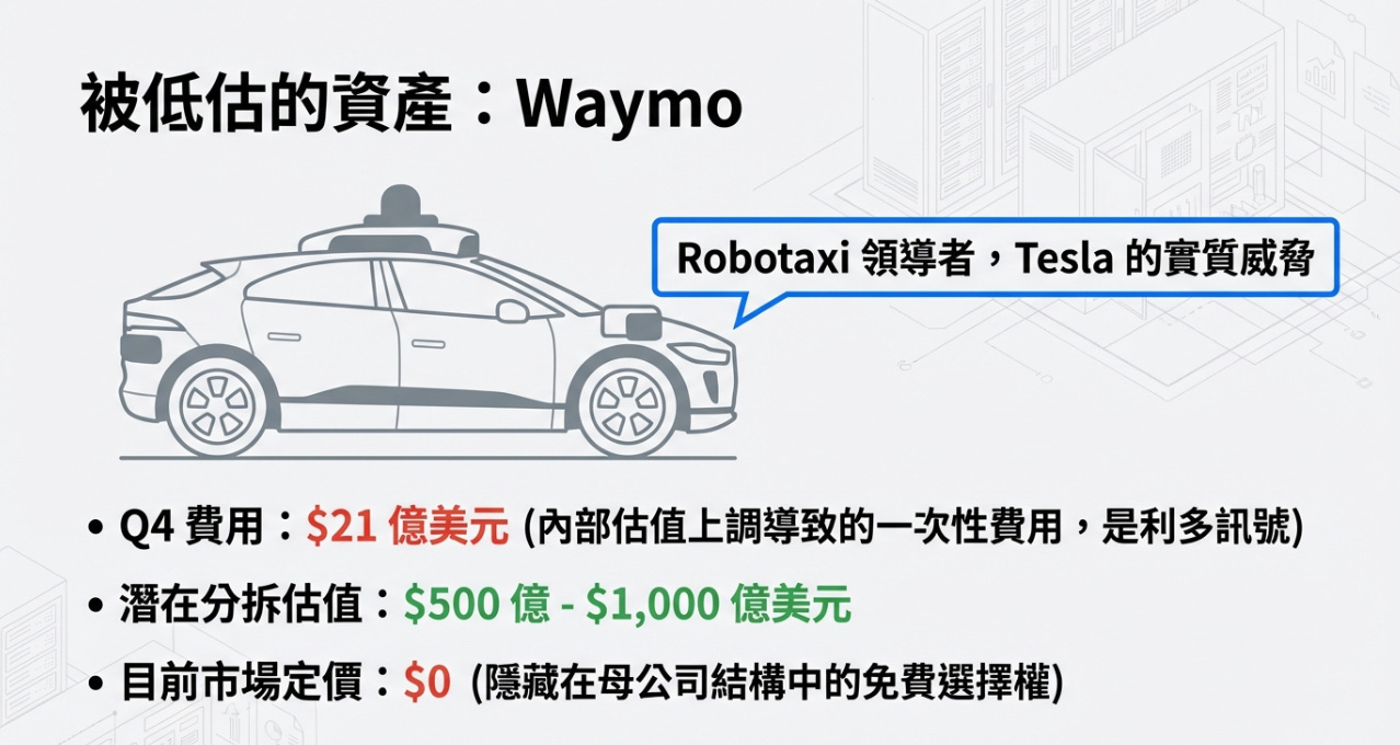Waymo 在全自駕計程車 (Robotaxi) 領域有一定的領先地位,甚至對 Tesla 構成了實質威脅。如果將 Waymo 獨立估值,這是一塊價值可能高達 500 億至 1,000 億美元的隱藏資產。