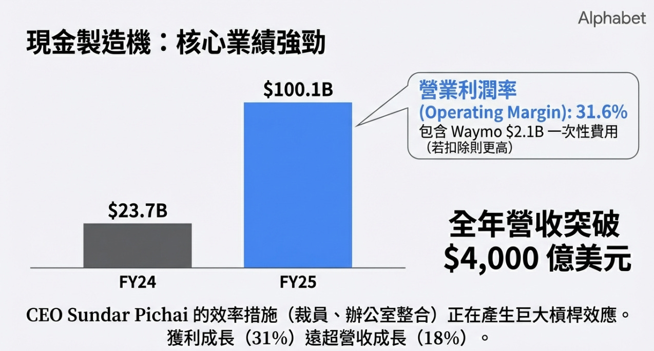 獲利增速遠大於營收增速,證明了過去兩年 CEO Sundar Pichai 推動的成本削減(裁員、辦公室整合)和基礎設施效率提升(AI 協助寫程式)產生了強大的營運效率。