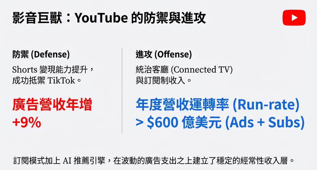 營收表現:廣告營收年增 9%,但更重要的是,包含 YouTube Premium、Music 和 YouTube TV 在內的總營收(廣告+訂閱)在 2025 年突破了 600 億美元。