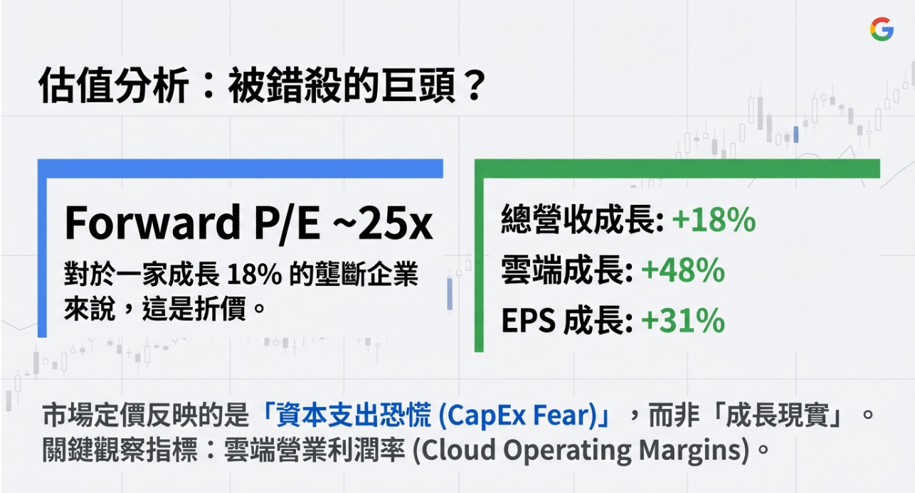 總營收成長 18%、雲端成長 48%、EPS 成長 31% 的壟斷型企業,本益比僅有 25 倍。相比微軟 (MSFT) 或亞馬遜 (AMZN) 的估值,股溝妹妹似乎又落難了。一旦市場確認其 AI 投資回報率 (ROI) 穩定,這個折價將迅速修復。