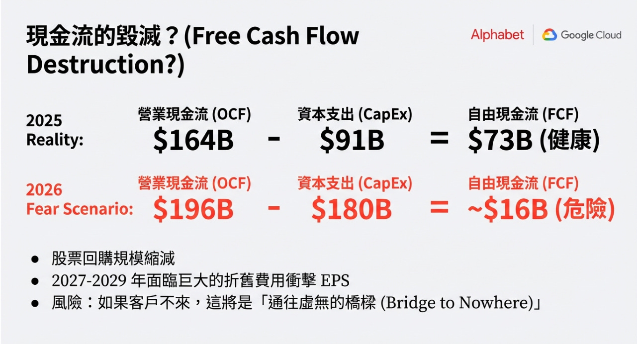 在 2025 年,谷歌的 OCF 約為 1,640 億美元,CapEx 約為 910 億美元,因此產生了高達 730 億美元的豐厚 FCF。這筆錢被用來大舉回購股票支撐股價。如果 2026 年的 CapEx 飆升至 1,800 億美元,假設 OCF 增長 20% 達到 1,960 億美元,那麼 2026 年的 FCF 將暴跌至區區 160 億美元(1960 - 1800)。