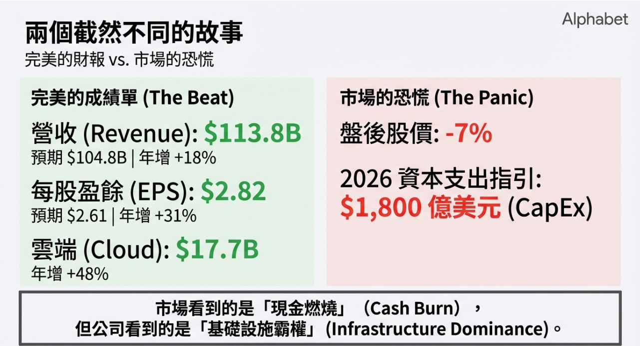 Alphabet 交出史上最強營收與雲端成長成績單,卻因為資本支出預測暴增而股價重挫 7%。這是市場在重新計算模型時出現的情緒失衡。我們必須區分「財務陣痛」與「商業衰退」。這兩者完全不同。