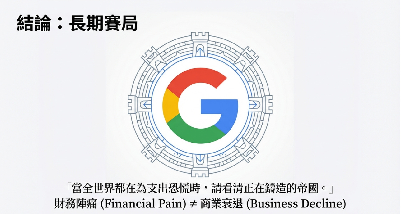 Google 現在面臨是轉型為「AI 算力與服務雙重巨頭」的陣痛,但1,800 億的資本支出阻絕了潛在競爭者的彎道超車可能。