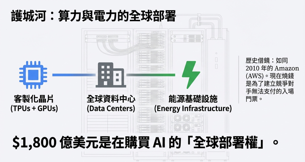 現在 Alphabet 在做的是把 Google 變成 AI 時代的基礎設施公司。這 1,800 億美元不是亂花,它在買GPU 算力、電力跟AI 推理能力的全球部署權。