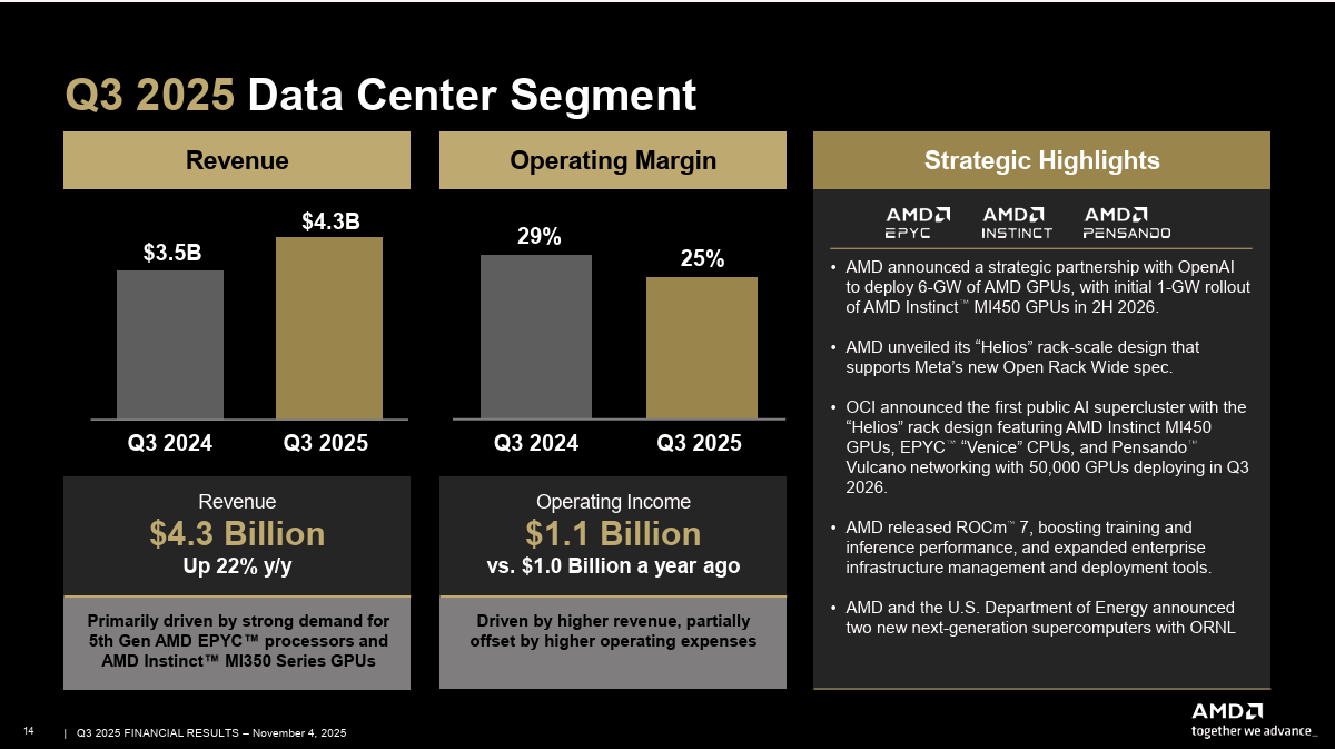 資料中心 (Data Center):營收 43 億美元,同比增長 22% — 由 EPYC 伺服器處理器和 Instinct AI 加速器的需求共同推動。