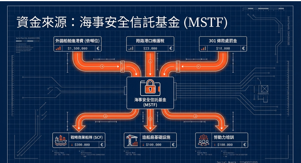 這筆錢會進入Maritime Security Trust Fund(MSTF),資金來源包括外國建造船舶港口費、301 條款對中國船舶處罰、陸路港口稅跟相關基礎設施費用。