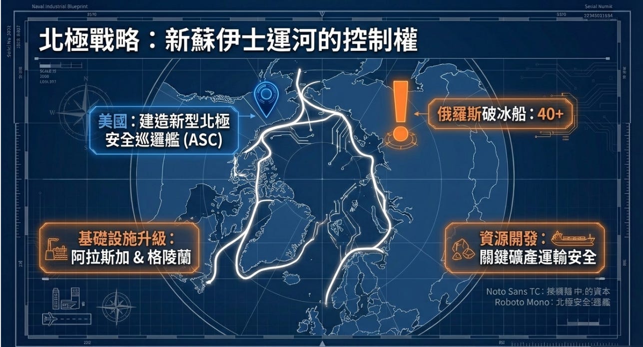 隨著冰層融化,北極成為大國競爭的新前線。MAP 要求加強在北極的存在感,包括建造 11 艘新型北極安全巡邏艦 (ASC),並加強阿拉斯加與格陵蘭島的基礎設施建設。