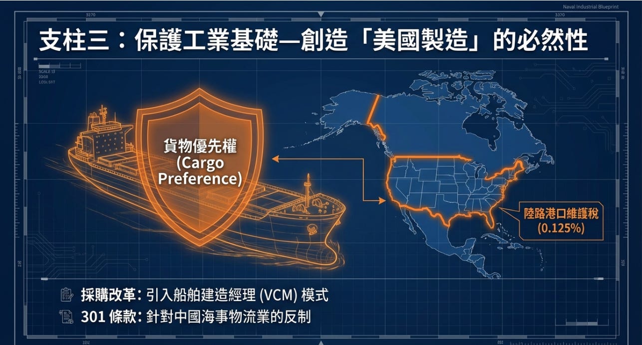 這是整個計畫裡最有殺傷力的部分。對所有「外國建造」的商船,只要進入美國港口徵收通用基礎設施或安全費,依噸位計算,幾乎所有全球貨櫃船都要繳。全球 80% 以上商船由中國、韓國、日本建造。這等於把全球航運當成美國造船業的提款機。