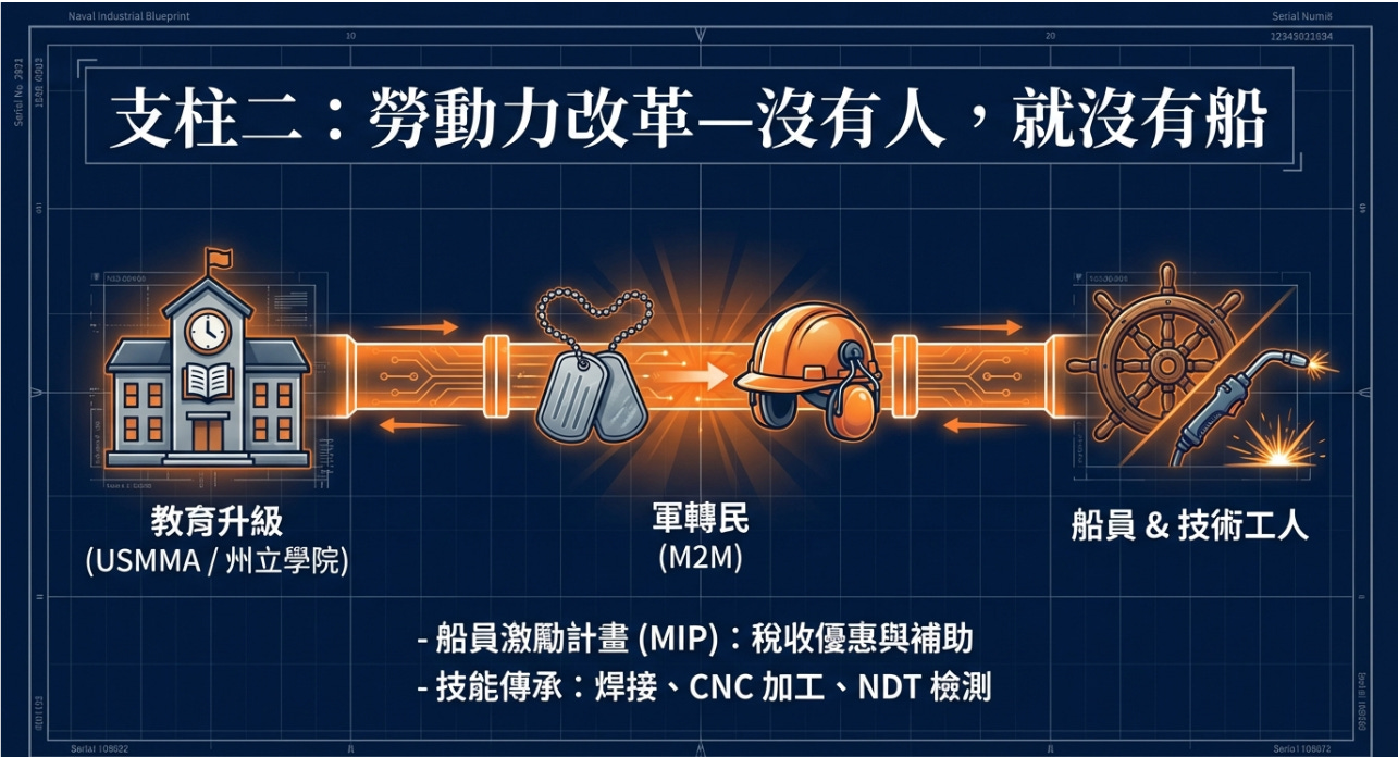 這是 MAP 最大的現實問題。美國造船技術工人年齡老化、海事工程人才短缺、商船船員數量不足,即使資金與設備到位,如果沒有熟練工人,產能無法釋放。這也是 MAP 強調海事繁榮區 (MPZ)、平價住房、技職教育補助,因為這是人口與技能結構問題。