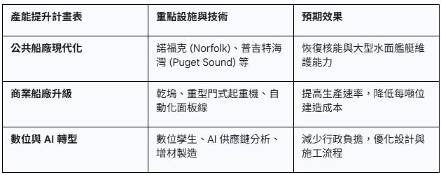 美國現在缺乾塢、重型起重機、自動化鋼板加工、模組化建造能力,MAP 的核心是把商業船廠升級成能生產大型遠洋船舶的現代工廠,而是重建工業生態。