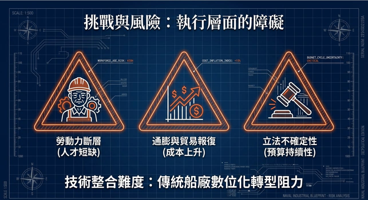船員數量銳減跟技術工人斷層是很大隱憂,因為造船是焊接、鋼材、重機操作。如果沒有技術世代接棒,再多預算也沒用。同時美國在推進系統、電子模組,這些都仍依賴外部供應鏈。在去風險化的背景下,這是重大漏洞。
