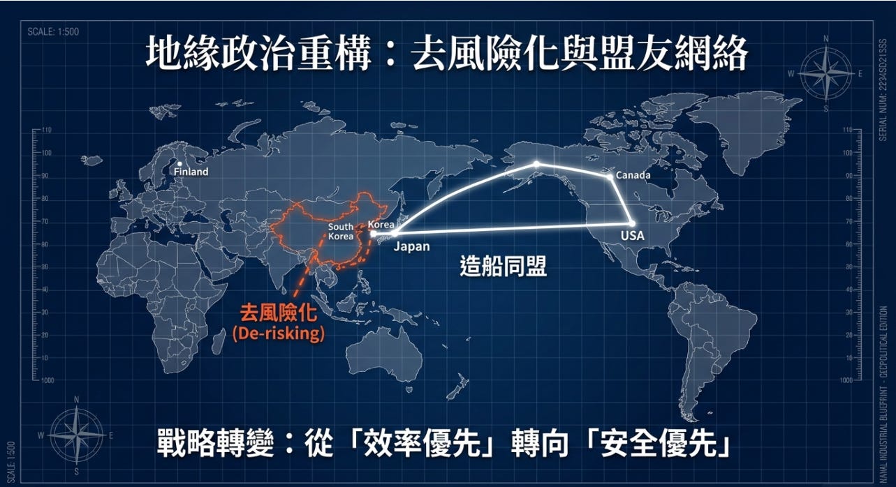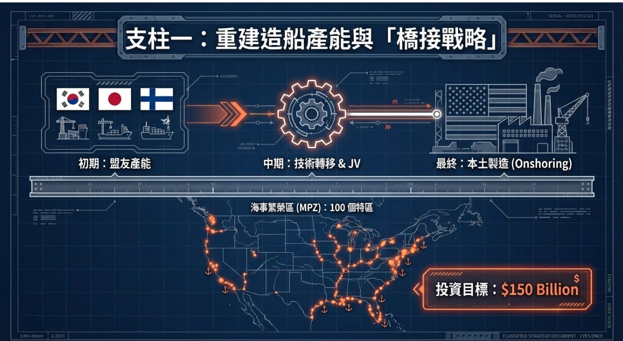 這是用盟友產能「墊高」美國產能。造船是高度規模經濟產業。如果沒有穩定訂單流,船廠永遠不會擴張。橋接戰略解決避免一開始交付延遲、確保技術轉移,最後迫使外國資本「進場下注」,目前傳出的投資意向金額至少 1,500 億美元