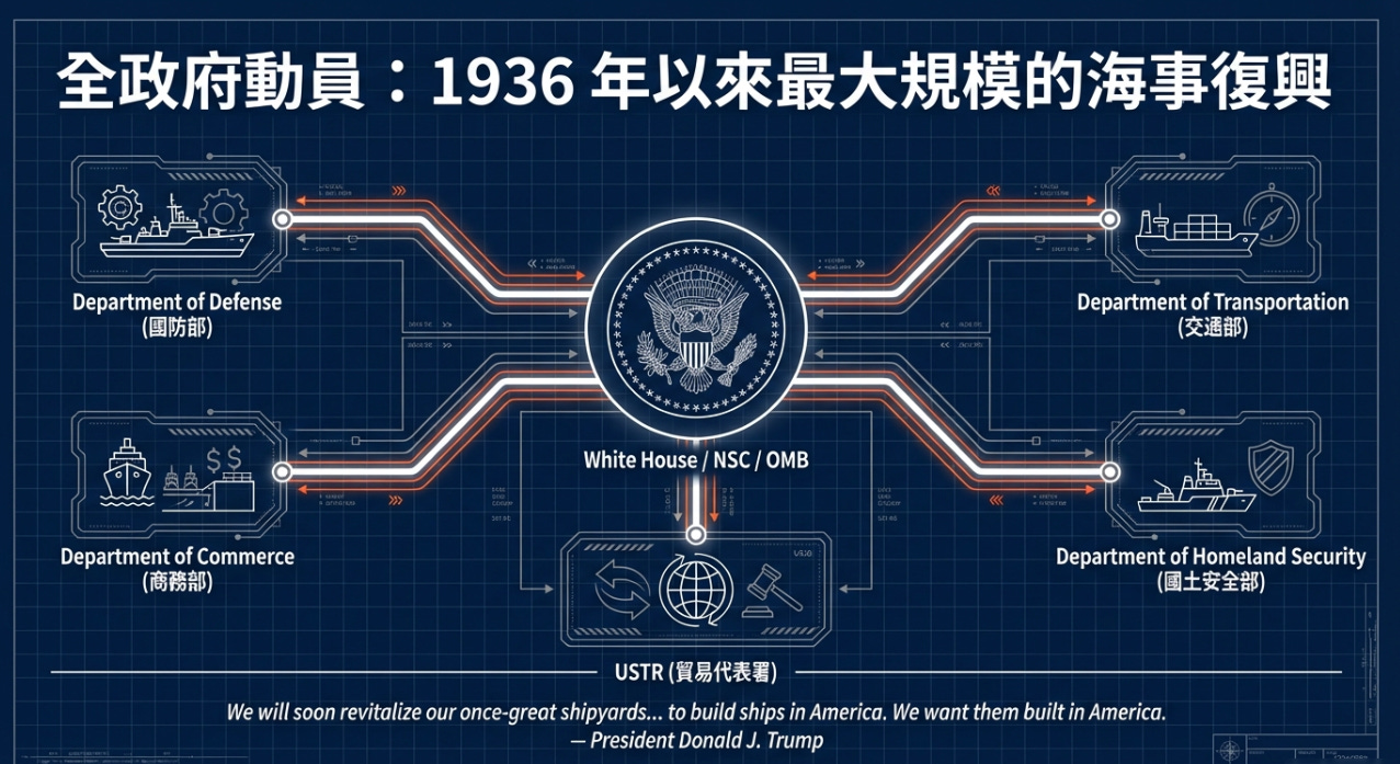 2025 年 4 月 9 日,總統簽署第 14269 號行政命令:《恢復美國海事主導地位》。主導來自Marco Rubio 跟 Russell Vought,因此海事能力已經被放到國家安全核心層級。這是白宮 + 國安會 + OMB 等級的戰略議題。
