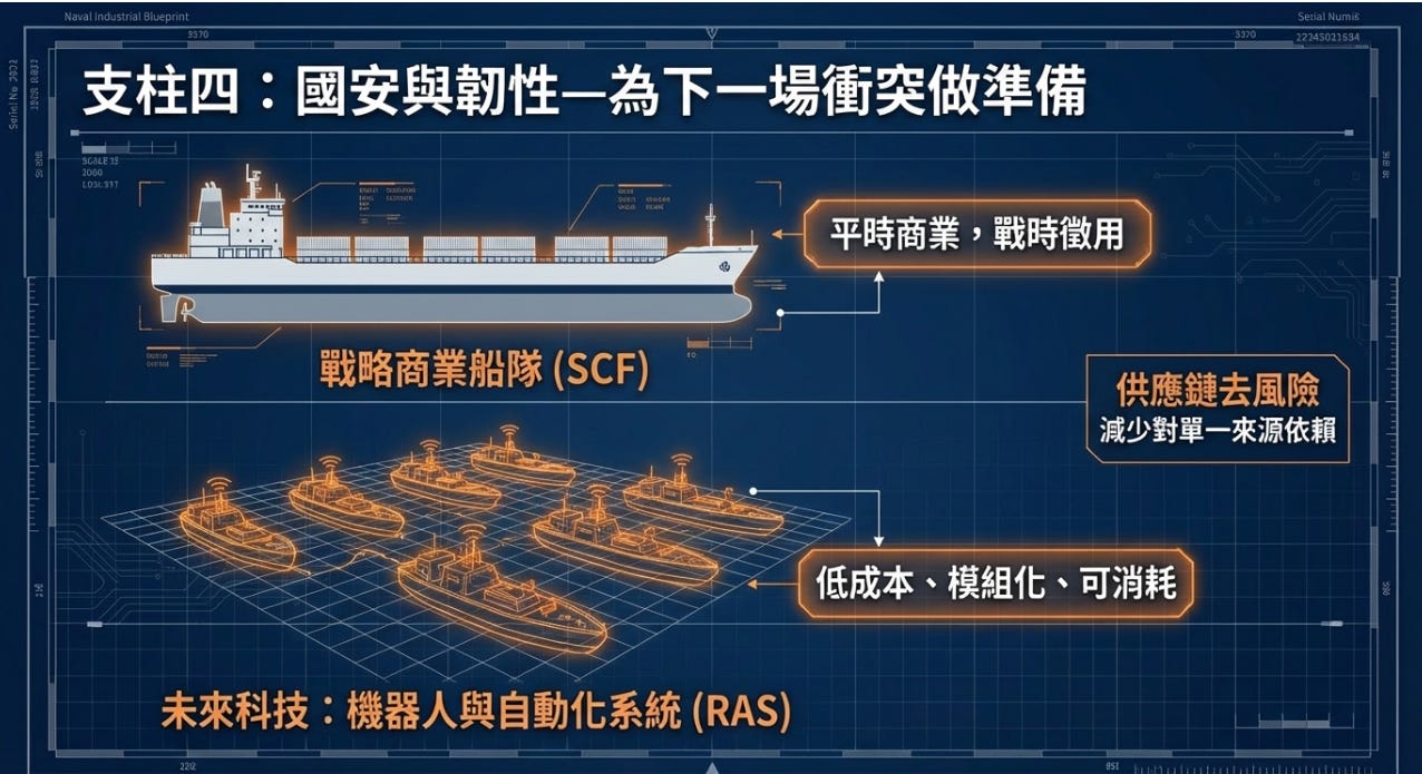 收進來的資金最重要的用途:戰略商業船隊(Strategic Commercial Fleet, SCF),這是一個準軍事化商船補貼計畫。政府將補助商業船東平時跑商業航線跟戰時優先供軍方調度,等於是商船版的「國民兵制度」。
