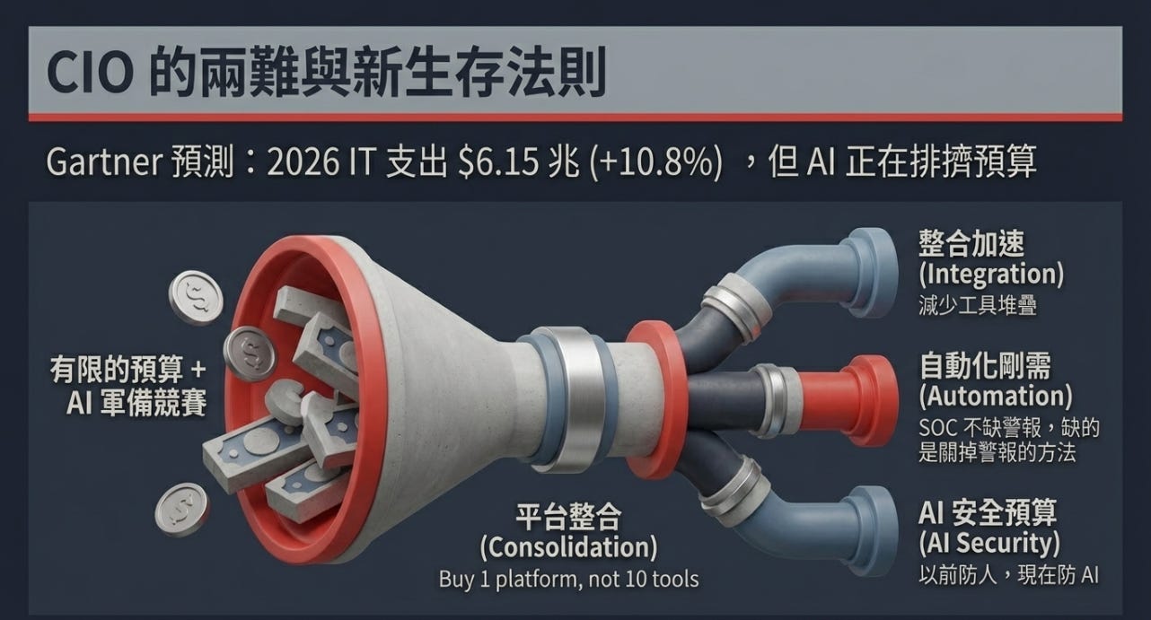 AI 會排擠預算。CIO 會逼所有供應商回答同一題:同樣的資安預算,要買到更多效益 → 平台整合、減少工具堆疊、強迫自動化。