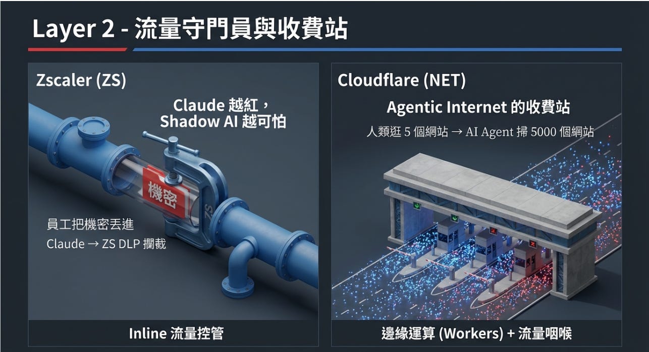 當 AI agent 變成網路的新用戶,以前人類逛 5 個網站,未來 agent 一次掃 5,000 個網站。那誰收過路費?雲邊緣網路與安全基建。