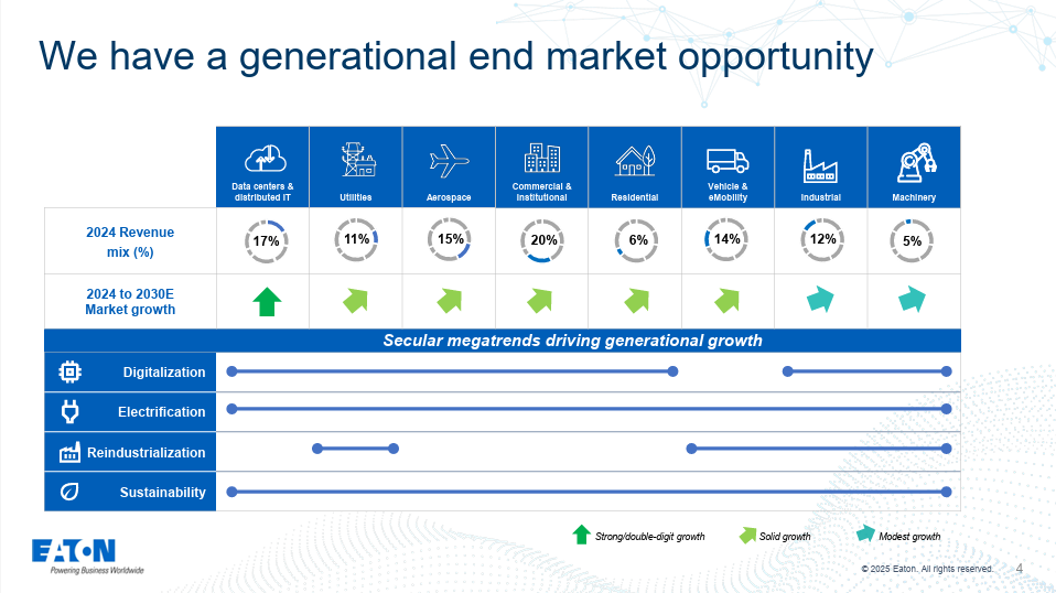 這句話是理解伊頓投資價值的核心。它將公司的未來,與四個確定性極高、持續數十年以上的長期宏觀趨 勢進行了深度綁定。投資伊頓,不再僅僅是投資一家工業製造公司,而是在投資整個社會基礎設施的現代化進程。無論經濟如何短期波動,世界對更高效、更可靠、更清潔的電力的需求,以及對空中交通和國防安全的需求,都是長期向上的。