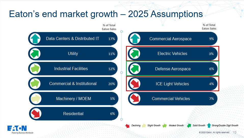 這是財報中唯一的弱點。這一下滑,主要反映的是全球汽車行業,特別是電動車市場,在經歷了前幾年的高速增長後,正進入一個去庫存和需求放緩的短期調整階段。這是一個行業性的普遍逆風,而非伊頓自身競爭力的問題。
