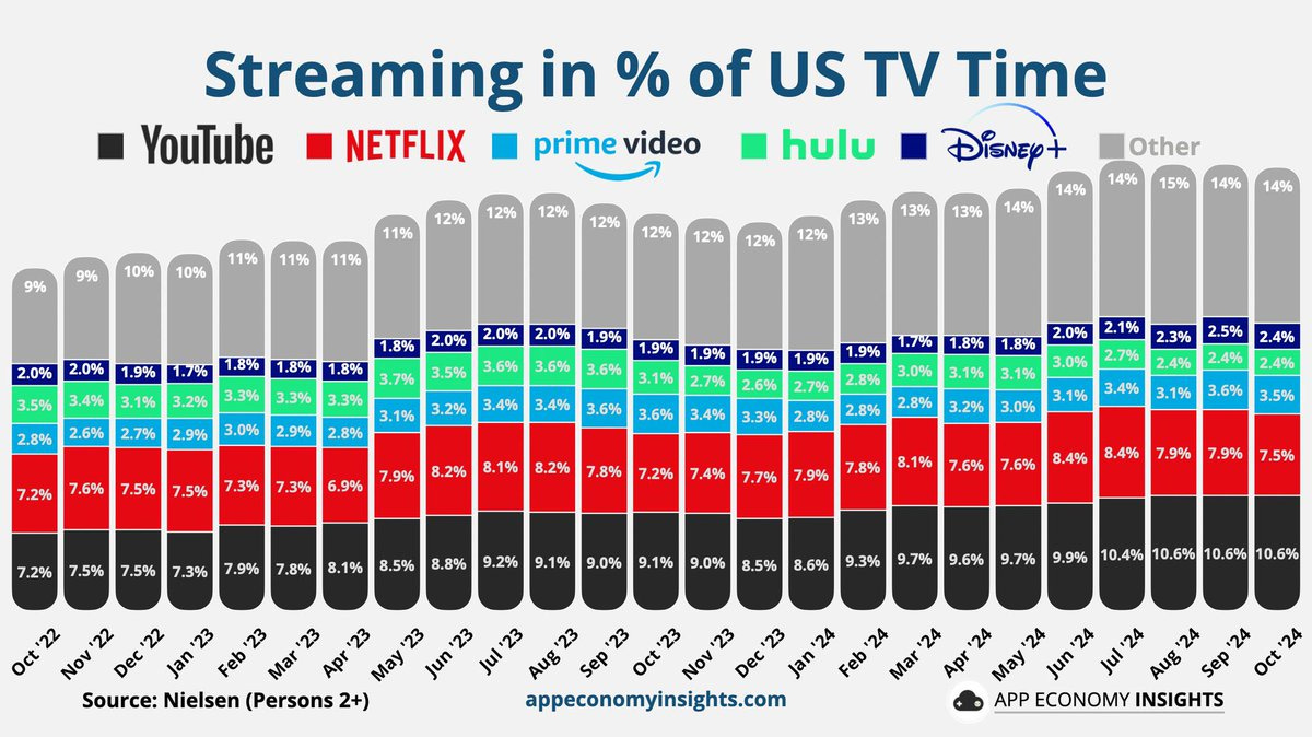 Youtube也大幅受到市場打折,去年該公司創造了 360 億美元的收入。相比之下,#NFLX 的收入為 390 億美元。Youtube 的收看時間份額比 NFLX 高,而且成長速度也會比它快。