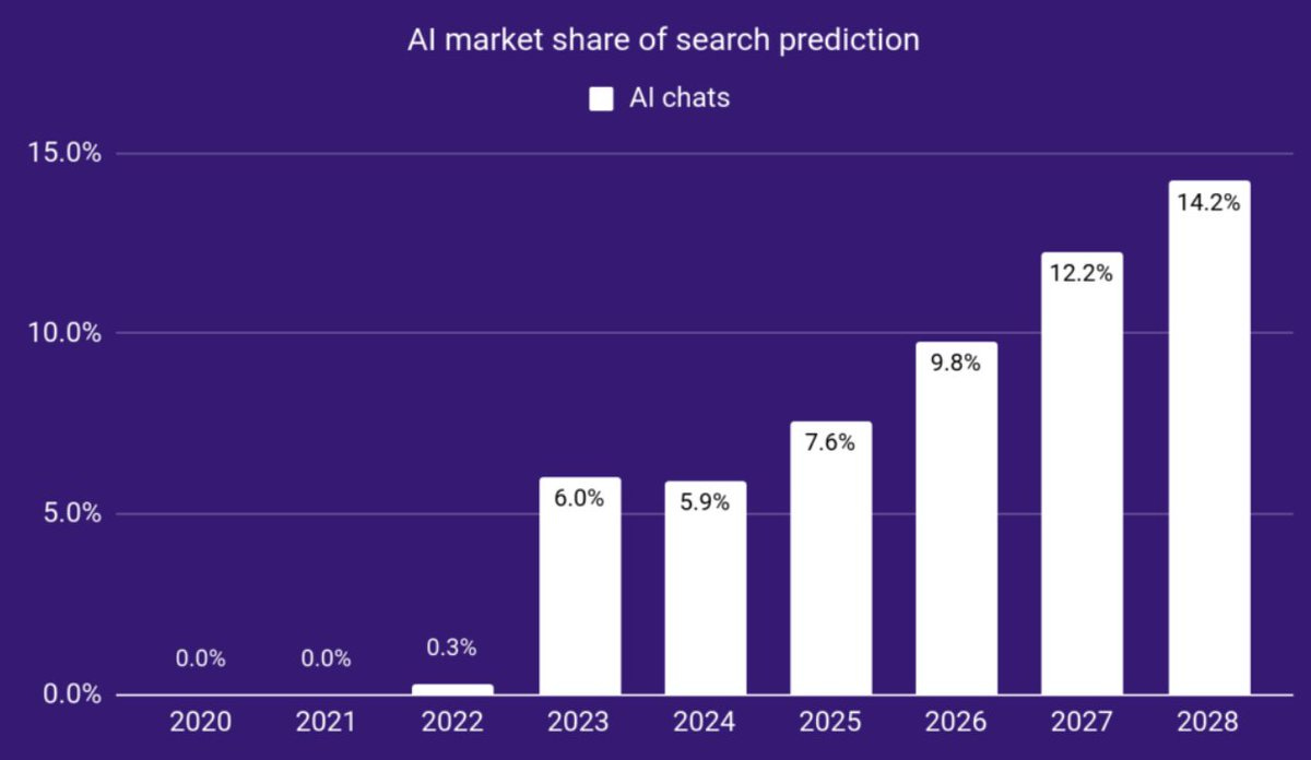 未來5年人工智慧在搜尋市場的佔有率不會超過20%。這適用於所有查詢。