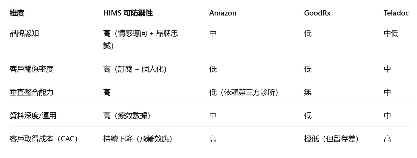 以下是針對 HIMS 相對於 Amazon Clinic、GoodRx、Teladoc 等主要競爭對手的比較分析在其護城河強度與可防禦性: