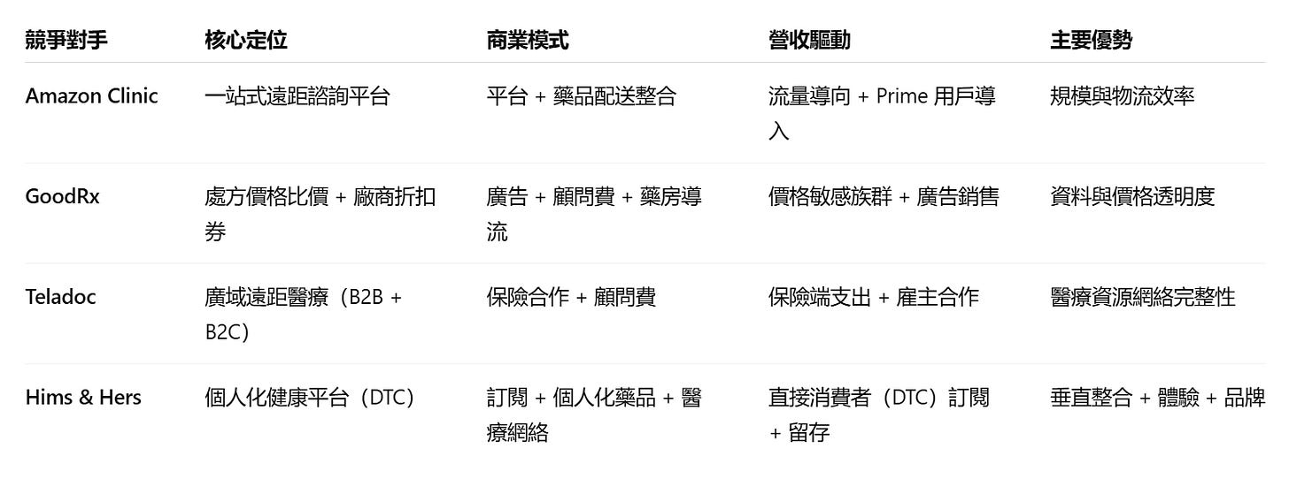 Amazon Clinic 和 GoodRx 代表「健康零售與價格導向」,在使用者需「一次性、方便、比價」的情境中有其優勢。