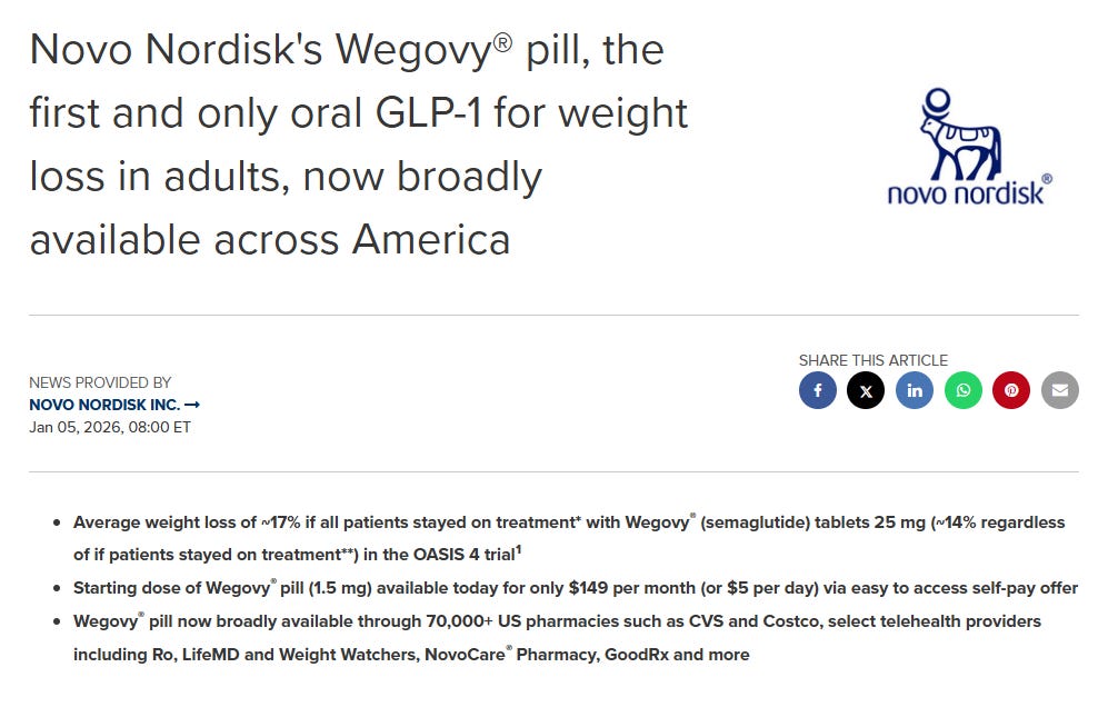 Link : https://www.prnewswire.com/news-releases/novo-nordisks-wegovy-pill-the-first-and-only-oral-glp-1-for-weight-loss-in-adults-now-broadly-available-across-america-302652205.html