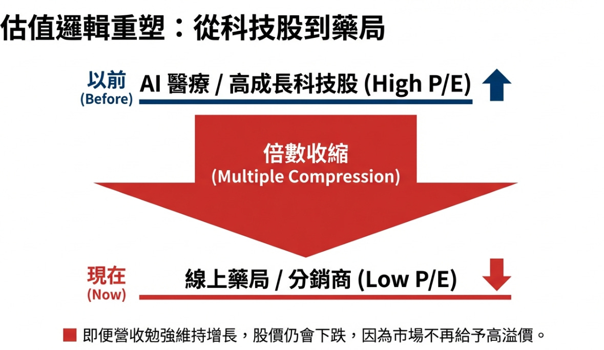 市場過去給 HIMS 高 PE,是把它當作高成長、科技驅動跟類 AI 醫療平台,現在GLP-1 的超額利潤消失後,HIMS 會被重新定義成什麼?