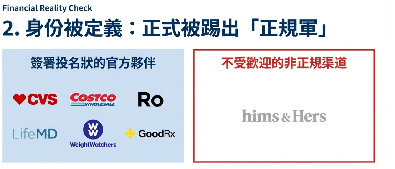 它在說「願意守規矩的,才是我們的合作夥伴。」HIMS 過去能賣 GLP-1,靠的是 FDA 的「短缺豁免」。現在原廠產能恢復,且公開拒絕合作,等於直接把 HIMS