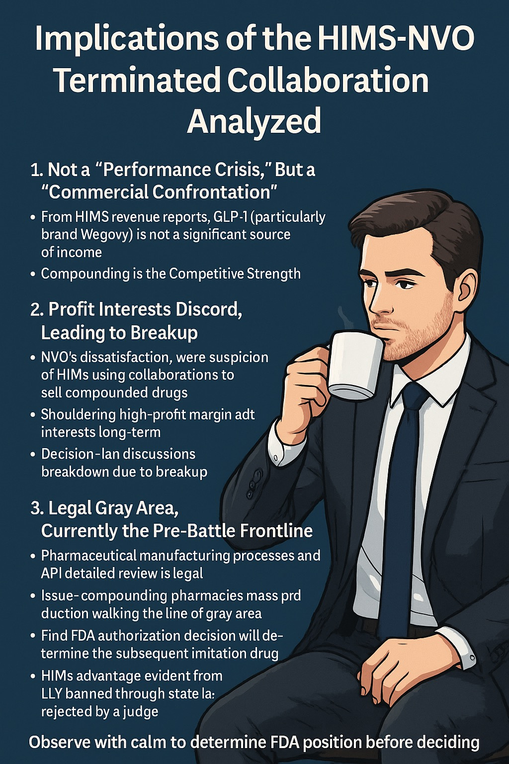 而從 HIM CEO 的回應看來,雙方在合約內部應該有不少爭執,甚至 NVO 可能希望 HIMS 放棄仿製藥,全面代理品牌藥,結果沒談成,合作就破局了。