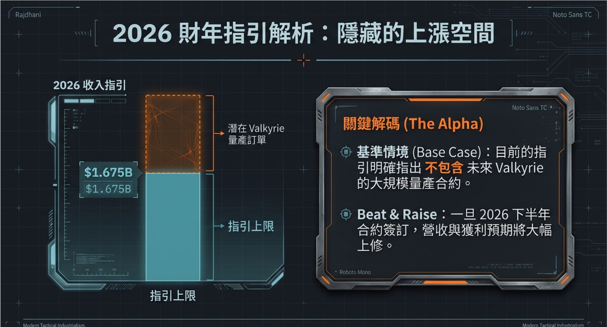 管理層在 2026 年指引中刻意將未來的 Valkyrie 量產大單「排除在基準情境之外」,這種保守的預期管理,讓習慣了瘋狂上修指引的動能投資人感到一絲不耐煩。但對於長線籌碼來說,這是非常健康的。