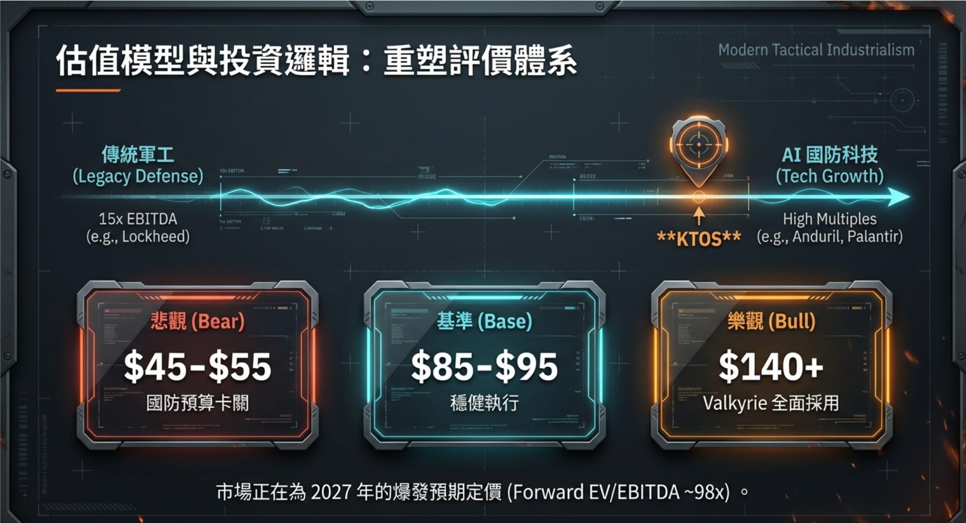 KTOS 已經完全脫離了傳統軍工股的估值體系(如 LMT 或 NOC 通常在 15 倍 EBITDA),它現在是 「AI 國防科技股」(對標 Anduril 或 Palantir)。